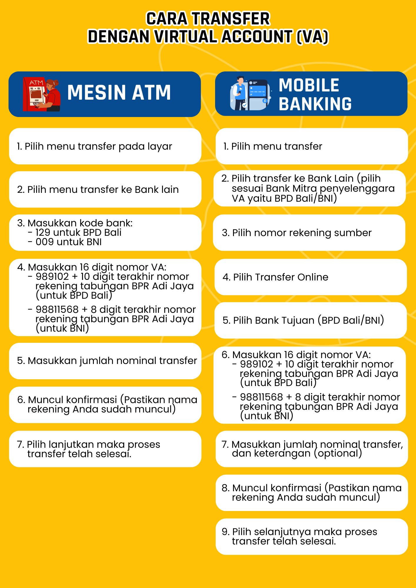 Guna memudahkan melakukan setoran & identifikasi setoran dana ke rekening tabungan Nasabah di PT. BPR Adi Jaya Mulia (Bank Adi Jaya) kapan pun, dimanapun dan realtime, sekarang Nasabah dapat melakukan transfer melalui mesin ATM, Mobile Banking, Internet Banking dan Dompet Elektronik melalui fasilitas Virtual Account (VA) Bank Adi Jaya.